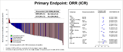 此次大会报告,陆教授介绍了奥美替尼的II期临床试验最新结果。本次研究纳入来自中国大陆和台湾的244例受试者,中位治疗时间为9.5个月(截至2019年5月25日),经独立评审委员会评估,奥美替尼单药治疗客观缓解率(ORR)、疾病控制率(DCR)令人振奋,显示出优异的耐药突变抑制作用;ORR亚组分析表明,奥美替尼在各亚组患者中均有效,其中在脑转移患者中也取得了良好的治疗效果;研究中出现的常见不良反应可耐受,且为临床可控的1或2级水平,3级及以上不良反应发生率和减量、停药率低,研究期间未见患者出现间质性肺病。会后点评环节,世界肺癌大会创始人、连续多届WCLC主席Paul,西班牙著名专家Robust等国际知名专家,高度评价了奥美替尼的研究成果及其与同类国际先进药物在疗效方面的可比拟性。