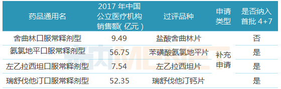 5个非“4+7”品种中,降糖药瑞格列奈有望入选第二批带量采购,据米内网数据,2017年中国公立医疗机构终端非胰岛素类降血糖药TOP20产品中,瑞格列奈片以10.15%的市场份额排位第二。瑞格列奈片原研厂家为诺和诺德,目前仅豪森药业提交该产品一致性评价补充申请并独家过评。