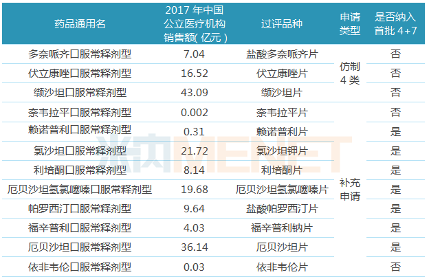 5个非“4+7”品种中,多奈哌齐、伏立康唑、缬沙坦在2017年中国公立医疗机构终端的销售额相对较高,盐酸多奈哌齐片原研厂家为卫材,过评企业包括华海药业及重庆植恩药业,伏立康唑片原研厂家为辉瑞,华海药业独家过评。