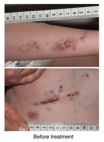 ▲治疗前,伊莎贝尔的手术部位(下)出现了细菌感染。体内的细菌很快穿破皮肤,来到了其他部位(上)(图片来源: