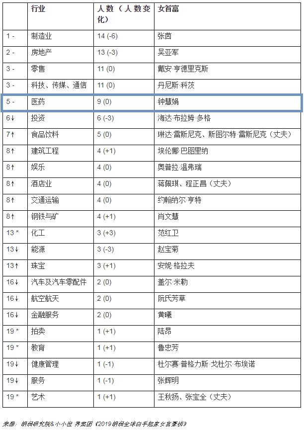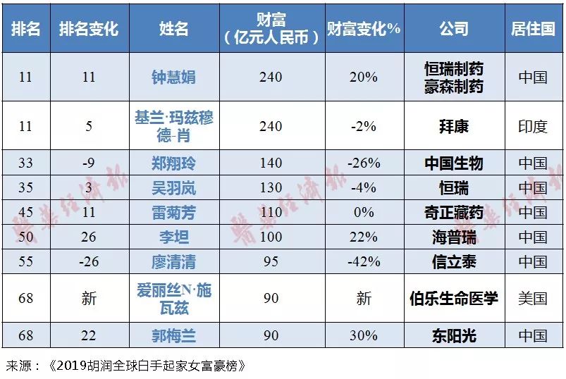 2019胡润全球白手起家女富豪榜医药行业上榜者