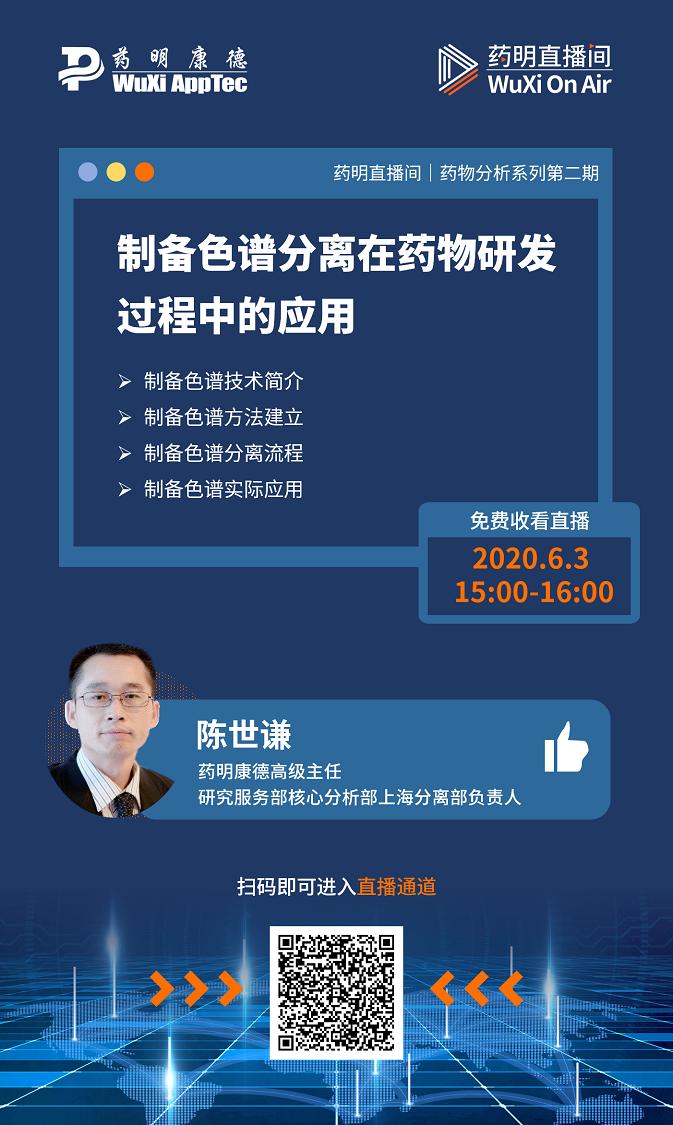 ,药明康德高级主任、研究服务部核心分析部上海分离部负责人陈世谦先生做客药明直播间,将与您分享“制备色谱分离在药物研发过程中的应用”,他将为您详细介绍各种制备色谱技术的原理和工作流程,并用实际案例展现该技术在药物研发中的应用,