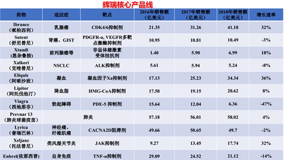 肿瘤市场,哌柏西利凭借疗效上的优势,已经成为了一线ER+、HER2-乳腺癌(占比60%)用药,销售业绩接连攀升,有望力成为全球最畅销的乳腺癌药物。辉瑞收购的恩杂鲁胺作为目前阶段最好的前列腺癌药物,18年增速18%,营收6.99亿美元。