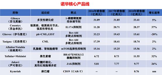 作为早期涉猎肿瘤的巨头公司,诺华的伊马替尼开创了肿瘤靶向治疗的先河,缔造了往昔的峥嵘时光。不过后期产品线的乏善可陈也让其在风起云涌的肿瘤江湖,丢掉原有的霸主地位。伊马替尼的升级版尼洛替尼、罕见病骨髓纤维化的芦可替尼、收购而来的Tafinlar+Mekinist都不足以焕发往日的荣光。备受瞩目的第一款CAR-T疗法Kymriah 2018年拿下了0.76亿美元的成绩,远低于吉利德的同款疗法Yescarta。