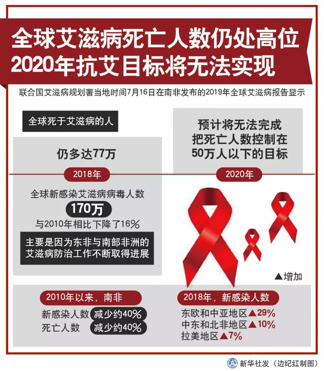7月16日,联合国艾滋病规划署发布全球艾滋病最新情况报告。报告指出,2018年,全球约有170万人新感染艾滋病病毒,与2010年相比下降了16%,主要归功于东非和南非大部分地区的稳定进展。南非自2010年以来,新发感染降低40%以上,相关死亡人数也减少了约40%。令人担忧的是,新发感染在东欧和中亚(29%)、中东和北非(10%)以及拉丁美洲(7%)有所增加。