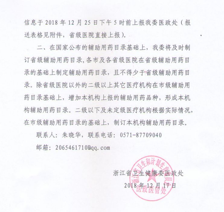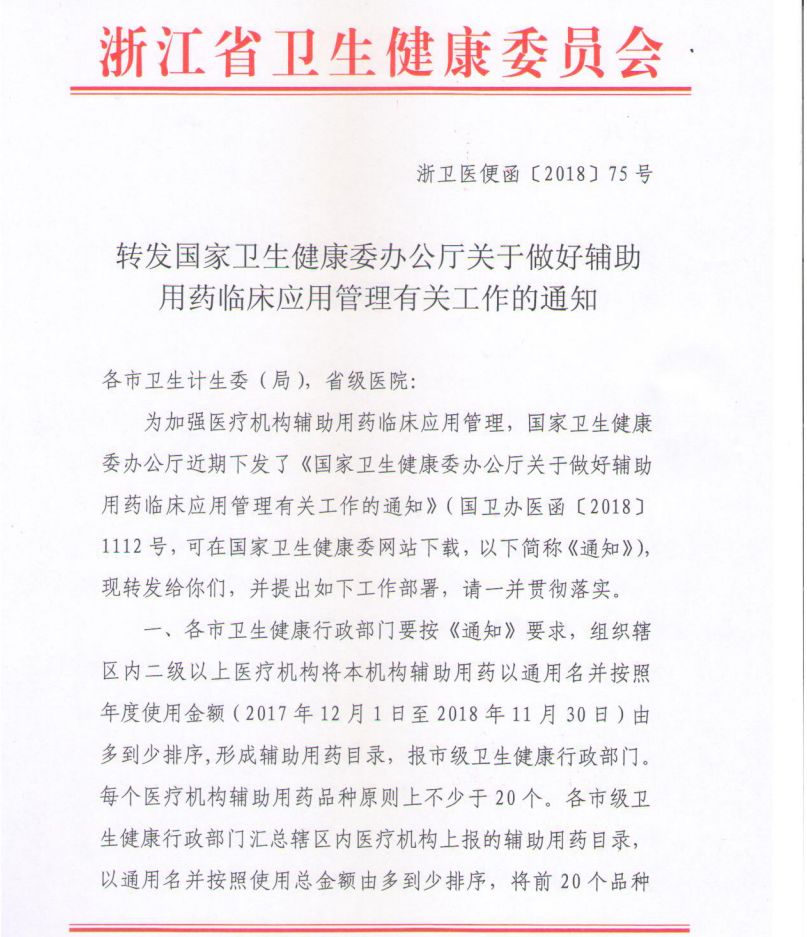 此前(2018年12月17日),浙江省卫健委转发了《国家卫健委关于做好辅助用药临床应用管理有关工作的通知》,对浙江省医疗机构辅助用药上报工作做出了部署。