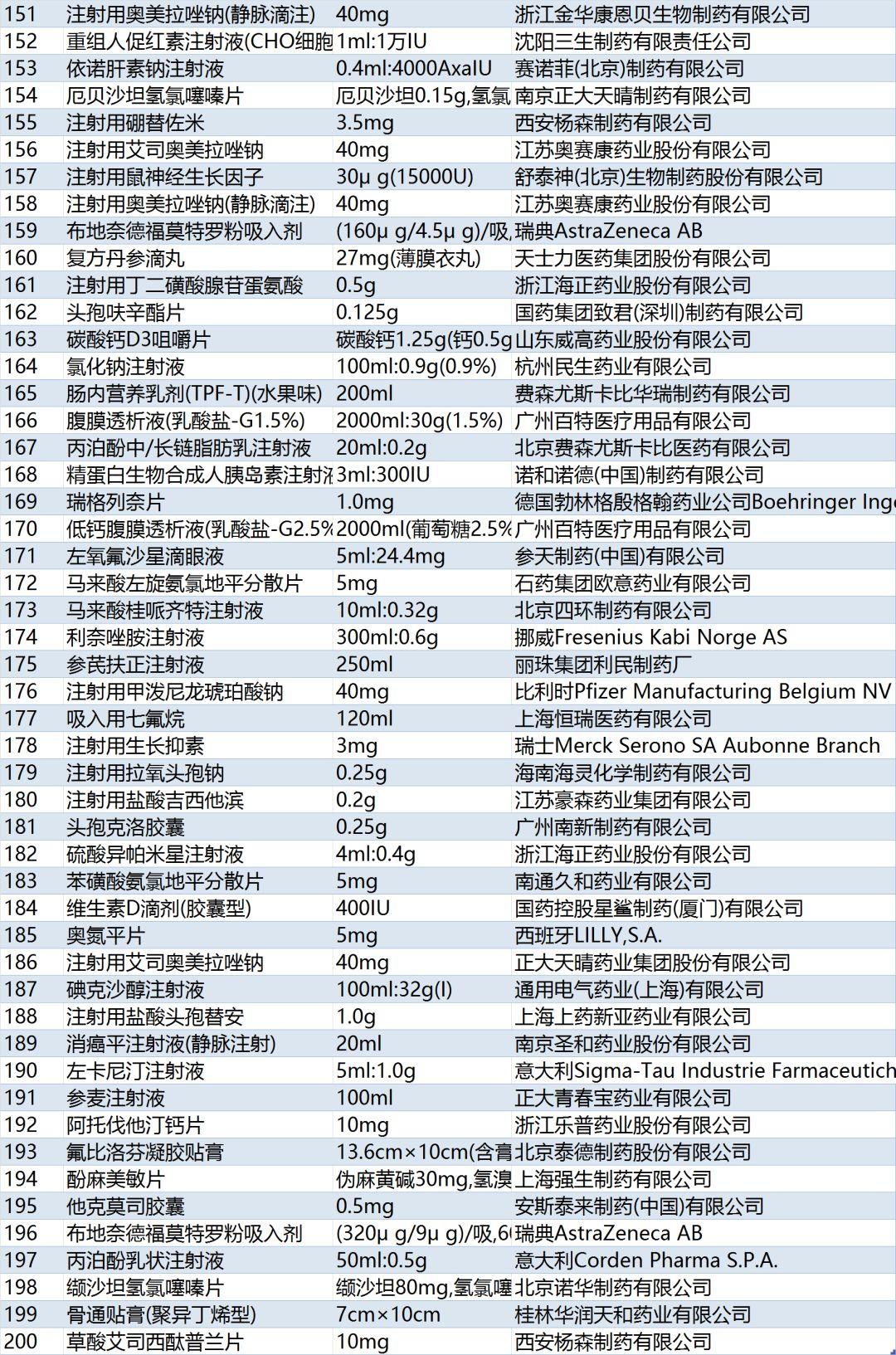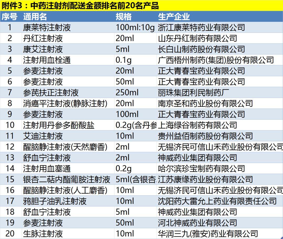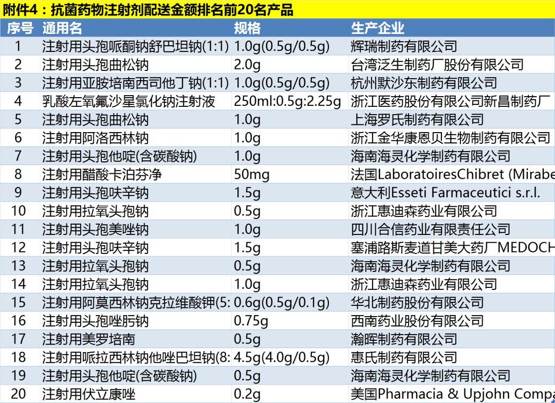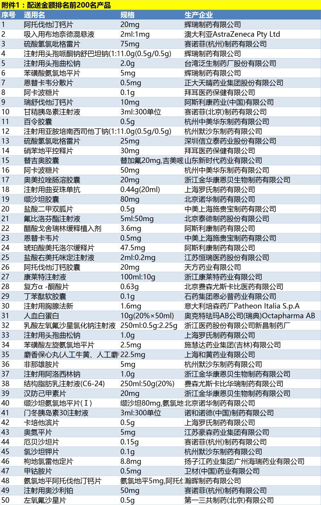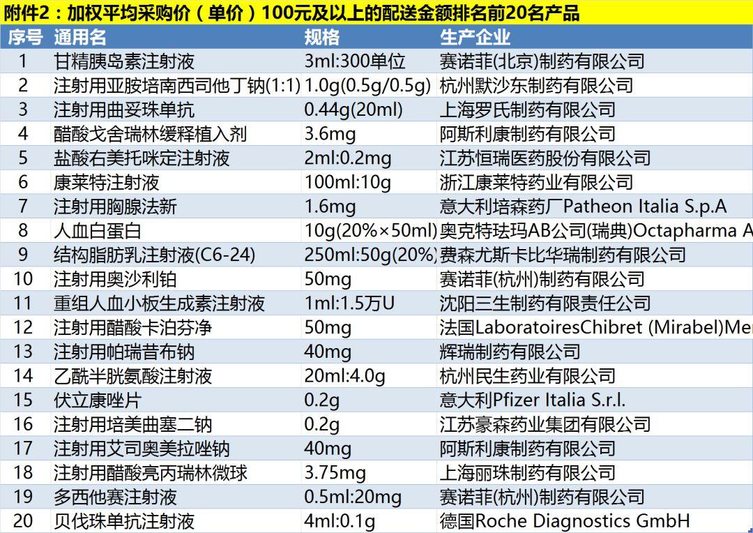 其中包括配送金额排名前200的药品、加权平均采购价(单价)100元及以上的配送金额排名前20名产品、中药注射剂配送金额排名前20名产品、抗菌药物注射剂配送金额排名前20名产品、抗菌药物口服制剂配送金额排名前20名产品等。