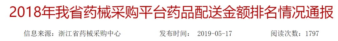 今日(5月17日),浙江省药械采购中心通报《2017年我省药械采购平台药品配送金额排名情况》。