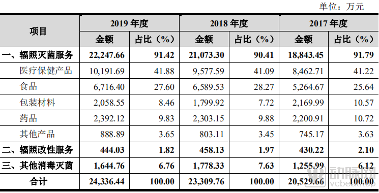 根据该公司披露的招股书显示,中金辐照在2017年至2019年从事的辐照服务业务中,医疗相关的消毒灭菌服务(包括医疗保健品辐照消毒、药品消毒以及其他消毒灭菌)占比该公司总收入的50%以上,历年总收入都在一亿元人民币之上:2017年医疗相关消毒灭菌收入超1.1亿元、2018年相关收入超1.3亿元、2019年相关收入超1.4亿元,医疗相关消毒灭菌收入逐年递增。