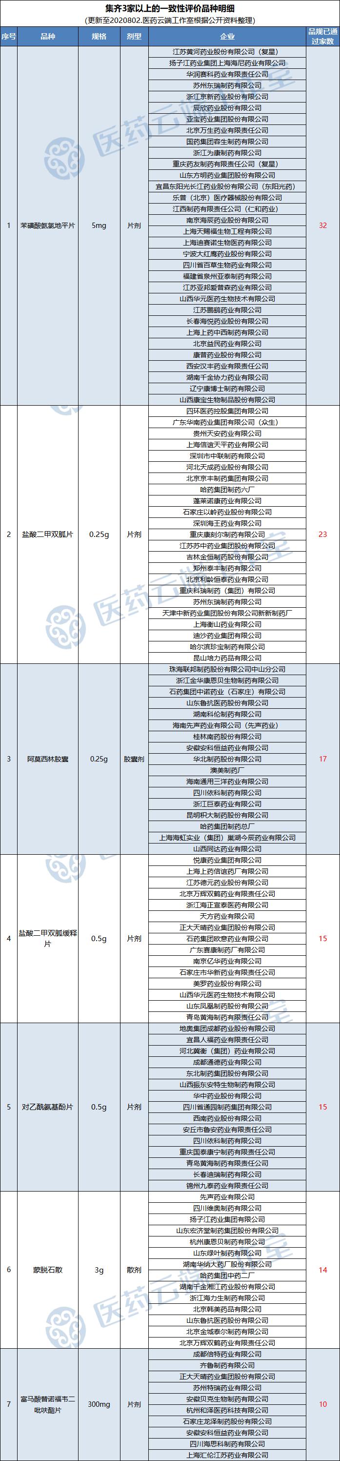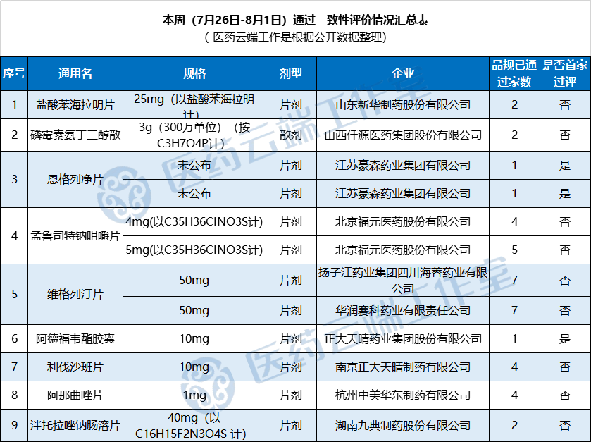 根据医药云端工作室统计,本周(2020年7月26日-2020年8月1日),新增9个品种通过一致性评价,具体如下表: