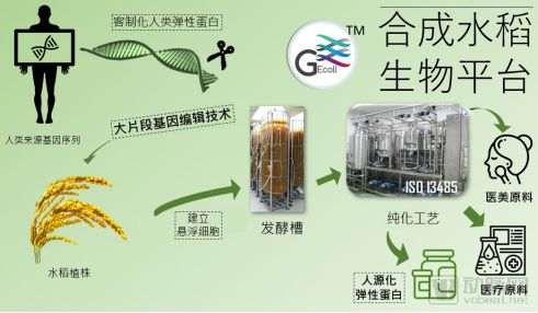 基可生医通过基因工程技术让水稻干细胞分泌表达蛋白质,从水稻干细胞分泌的悬浮液中,萃取人类的弹性蛋白,让素食主义者也能够安心使用植物来源的生医原料。