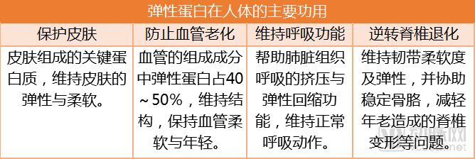 弹性蛋白,是一具有弹性纤维的蛋白质,广泛分布在动物体内的各个组织和脏器中,主要存在于颈韧带、血管、肺、皮肤等有弹性的组织中,对于形态的支撑发挥重要的作用,是一个稀少、价格昂贵,却对于组织再生修复来说很重要的原料。