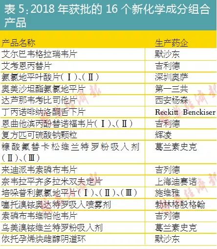 2018年,共有16个新化学成分组合产品获批。属于旧注册分类1.5类的产品(即未在国内外上市销售的新复方制剂)是深圳奥萨的氨氯地平叶酸片(Ⅰ)(Ⅱ),这是自临床自查核查以来首个获批上市的旧注册分类1.5类新化学成分组合。