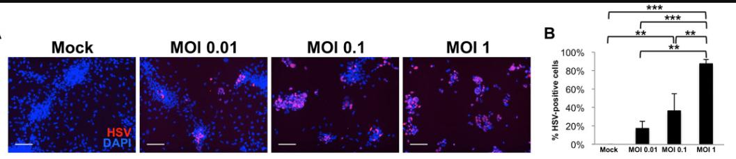 首先,hiNSC是的确可以被HSV-1感染的。在感染复数(MOI)为1的情况下,共培养24小时,几乎100%的hiNSC都感染了HSV-1,病毒水平随培养时间延长而增加。同时,感染细胞也能够分泌HSV-1感染其他细胞。