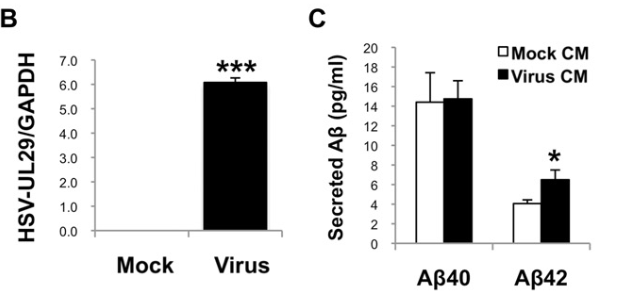 经过qPCR,研究者发现,HSV-1会引起APP和BACE1表达的下调,以及PSEN1/2表达的上调。