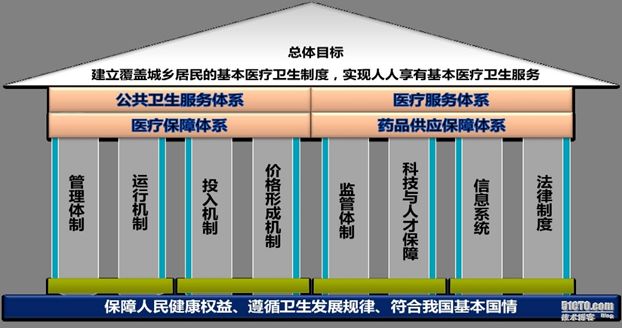 *一个目标是建立基本医疗卫生服务制度;四梁即——公共卫生服务体系、医疗服务体系、医疗保障体系和药品供应保障体系。八柱即八中制度,分别为:协调统一的医药卫生管理体制、高效规范的医药卫生机构运行机制、政府主导的多元卫生投入机制、科学合理的医药价格形成机制、严格有效的医药卫生监管体制、可持续发展的医药卫生科技创新机制和人才保障机制、实用共享的医药卫生信息系统、医药卫生法律制度。