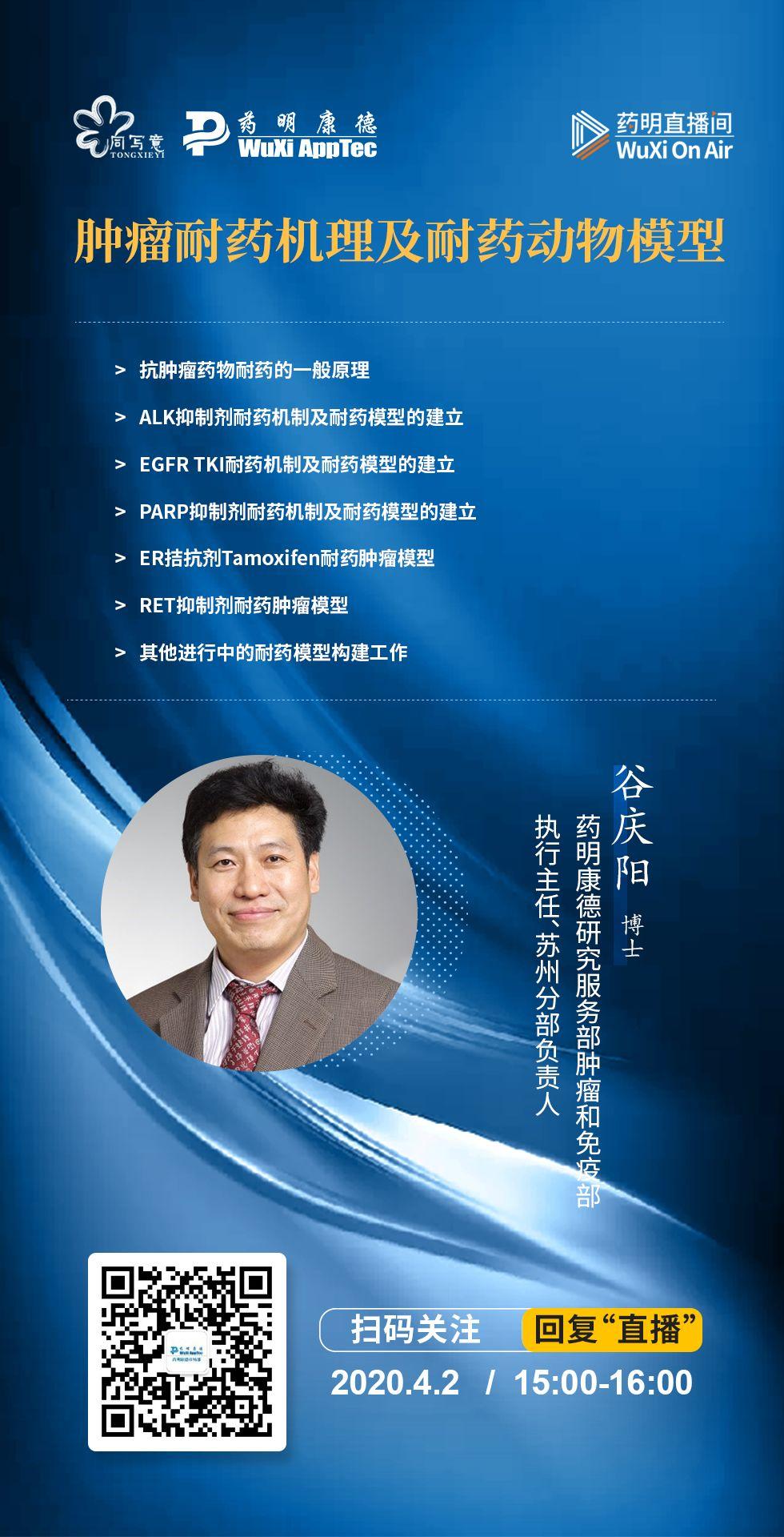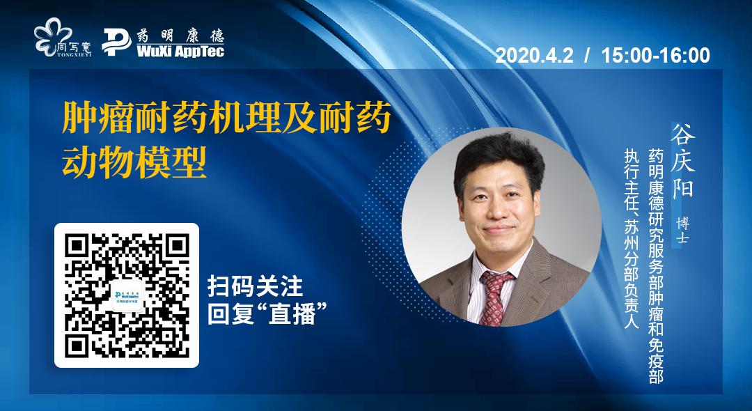 此次,我们特别邀请药明康德研究服务部肿瘤和免疫部执行主任,肿瘤和免疫部苏州分部负责人谷庆阳博士与大家进行在线交流。谷博士将围绕最新肿瘤耐药机制进行概括综述,并进一步的介绍药明康德肿瘤和免疫部在肿瘤耐药动物模型的建立和验证方面所取得的进展,助力新一代抗肿瘤药物的发现。